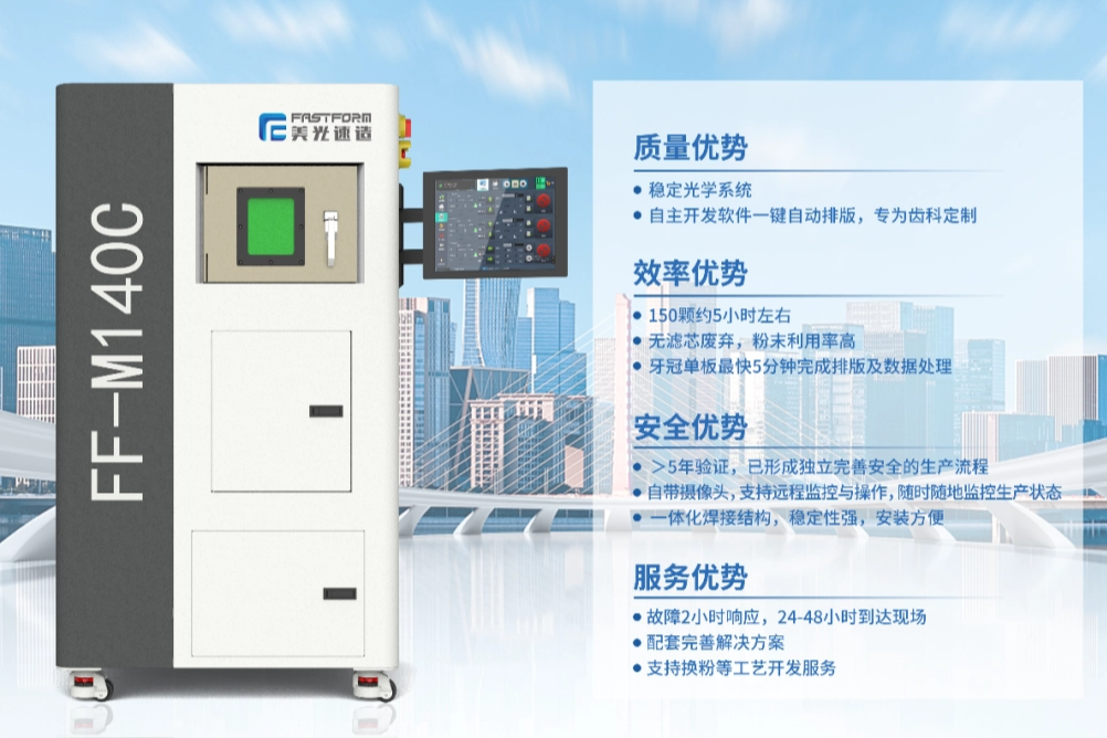 FF-M140C是美光速造推出的一款極具性價比的金屬3D打印機,專為齒科領域量身打造,深度契合齒科生產需求。它操作簡單便捷,兼具“專業化”與“高精度”特性,能在5小時內打印150顆牙冠或15個支架,精準滿足企業小批量靈活生產需求,堪稱義齒加工行業提升生產速度的革新之選。每套設備免費配備美光自研的FastLayer切片軟件與FastFab實時監控軟件,全方位助力齒科數字化轉型,讓生產過程更高效、精準、可控。