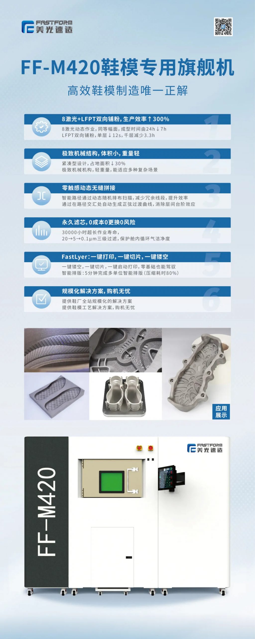 FF-M420在全系標配8激光的基礎上,采用LFPT光跟隨雙向鋪粉技術,通過激光與鋪粉同步作業,為8激光加上一道專業的賽車道,實現8激光的快道超車,讓鞋模打印時間由24h降至7h。